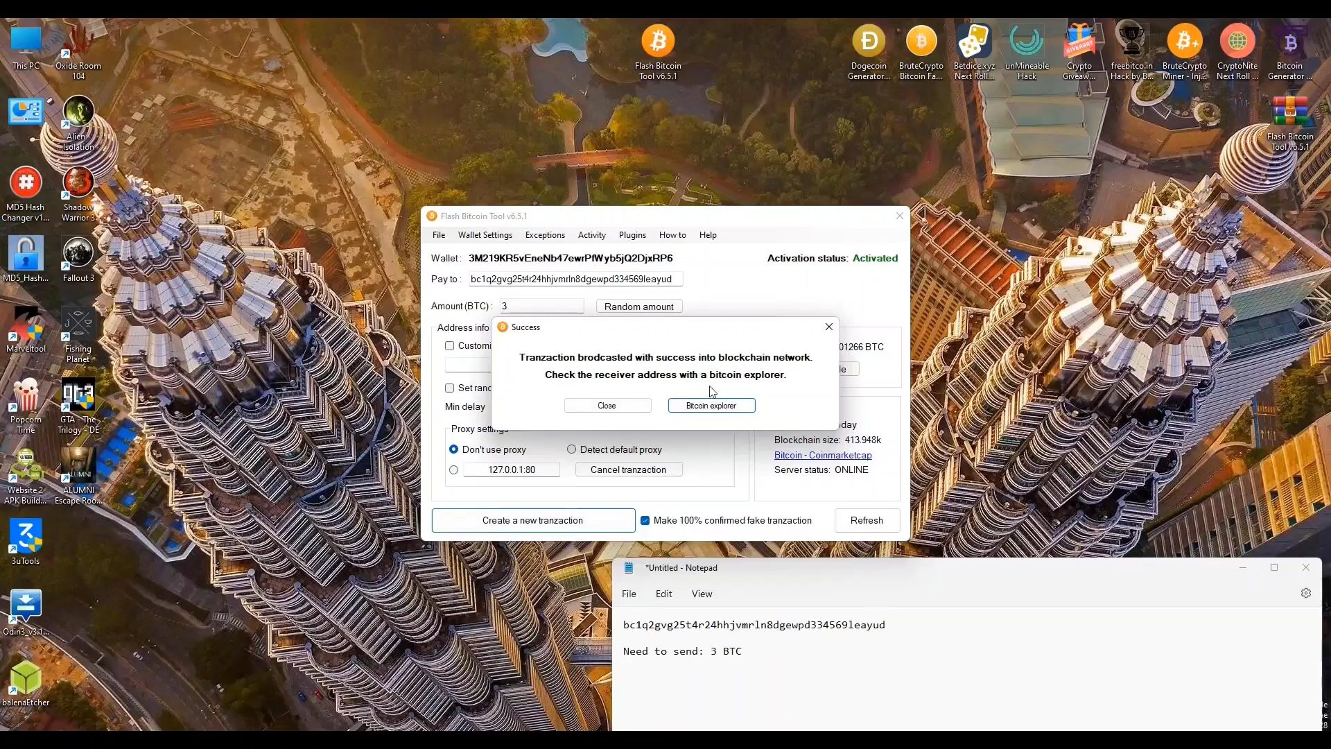 Flash Bitcoin Tool is a software that allows to send fake bitcoins on the blockchain networks. Bitcoins can stay in the wallet for at maximum 360 days before being rejected by blockchain and disappear from the wallet are sent to. We present you the new version of Flash Bitcoin Tool